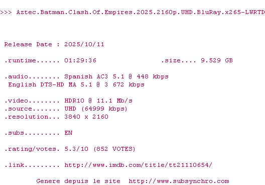 La release Aztec.Batman.Clash.Of.Empires.2025.2160p.UHD.BluRay.x265-LWRTD est en 4K