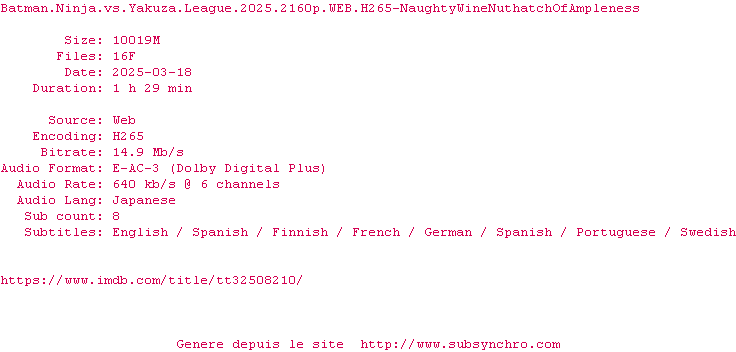 Y avez-vous pense ? Nous proposons déjà 2 sous-titres pour le film Batman Ninja vs. Yakuza League. Avez-vous essaye de voir si ces sous-titres etaient compatibles avec cette release ? On vous laisse le soin de tester cela pour nous et de contribuer au site en postant le sous-titre en cas de compatiblite constatee !