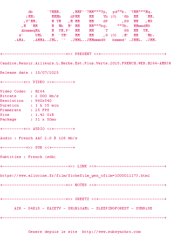 Y avez-vous pense ? Nous proposons déjà 1 sous-titre pour le film Candice Renoir : Ailleurs l'herbe est plus verte. Avez-vous essaye de voir si ces sous-titres etaient compatibles avec cette release ? On vous laisse le soin de tester cela pour nous et de contribuer au site en postant le sous-titre en cas de compatiblite constatee !