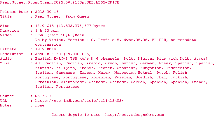 La release Fear.Street.Prom.Queen.2025.DV.2160p.WEB.H265-EDITH est en 4K