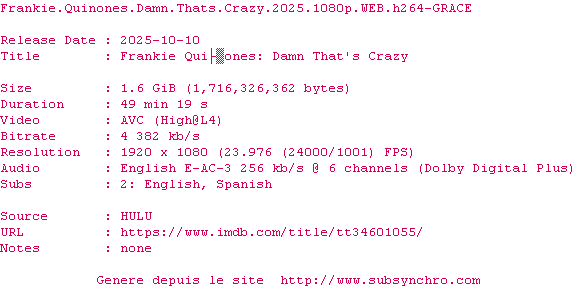 Y avez-vous pense ? Nous proposons déjà 2 sous-titres pour le film Frankie Quiñones: Damn That's Crazy. Avez-vous essaye de voir si ces sous-titres etaient compatibles avec cette release ? On vous laisse le soin de tester cela pour nous et de contribuer au site en postant le sous-titre en cas de compatiblite constatee !