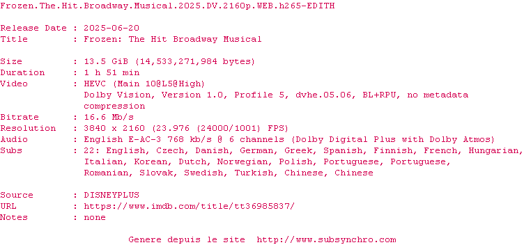 La release Frozen.The.Hit.Broadway.Musical.2025.DV.2160p.WEB.H265-EDITH est en 4K