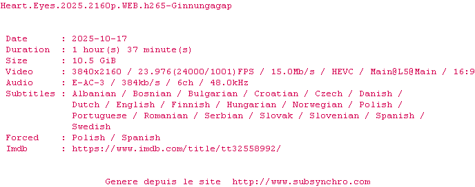 Y avez-vous pense ? Nous proposons déjà 3 sous-titres pour le film Heart Eyes. Avez-vous essaye de voir si ces sous-titres etaient compatibles avec cette release ? On vous laisse le soin de tester cela pour nous et de contribuer au site en postant le sous-titre en cas de compatiblite constatee !