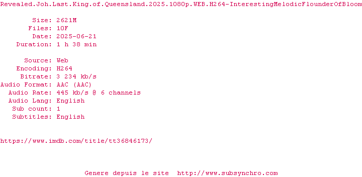 Telechargez le RSS « Fichier de la release Revealed.Joh.Last.King.Of.Queensland.2025.1080p.WEB.H264-InterestingMelodicFlounderOfBloom »
