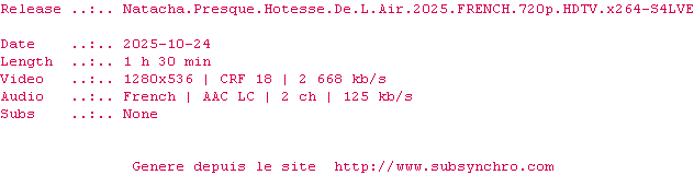 Y avez-vous pense ? Nous proposons déjà 1 sous-titre pour le film Natacha (presque) hôtesse de l’air. Avez-vous essaye de voir si ces sous-titres etaient compatibles avec cette release ? On vous laisse le soin de tester cela pour nous et de contribuer au site en postant le sous-titre en cas de compatiblite constatee !
