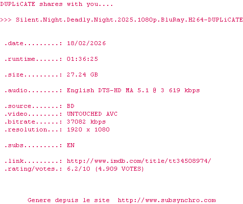 Telechargez le RSS « Fichier de la release Silent.Night.Deadly.Night.2025.1080p.BluRay.H264-DUPLiCATE »