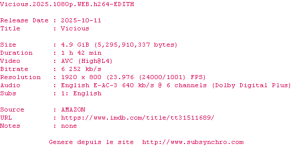 Y avez-vous pense ? Nous proposons déjà 4 sous-titres pour le film Vicious. Avez-vous essaye de voir si ces sous-titres etaient compatibles avec cette release ? On vous laisse le soin de tester cela pour nous et de contribuer au site en postant le sous-titre en cas de compatiblite constatee !