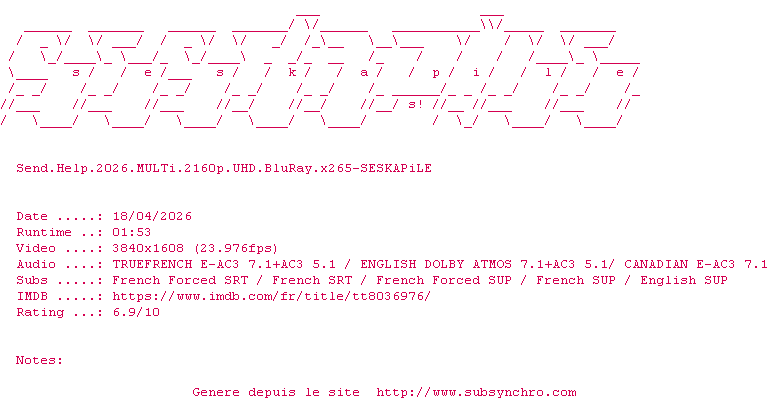 Y avez-vous pense ? Nous proposons déjà 1861 sous-titres pour le film Send Help. Avez-vous essaye de voir si ces sous-titres etaient compatibles avec cette release ? On vous laisse le soin de tester cela pour nous et de contribuer au site en postant le sous-titre en cas de compatiblite constatee !