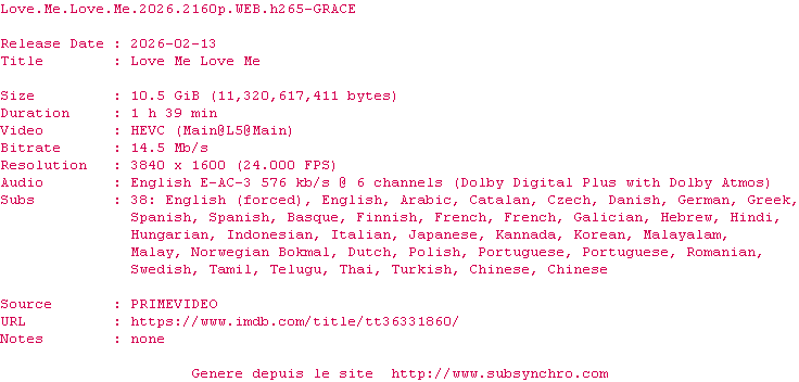 Telechargez le RSS « Fichier de la release Love.Me.Love.Me.2026.2160p.WEB.H265-GRACE »