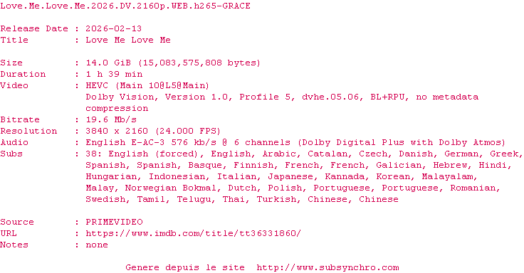 La release Love.Me.Love.Me.2026.DV.2160p.WEB.H265-GRACE est en 4K