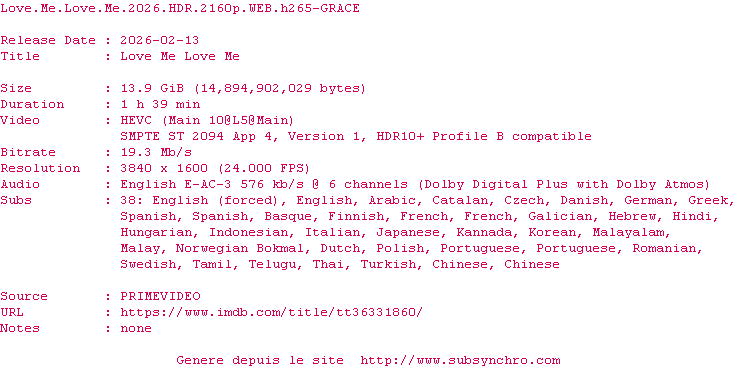 Telechargez le RSS « Fichier de la release Love.Me.Love.Me.2026.HDR.2160p.WEB.H265-GRACE »