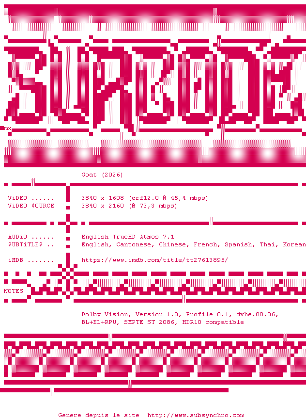 Y avez-vous pense ? Nous proposons déjà 2138 sous-titres pour le film Goat - rêver plus haut. Avez-vous essaye de voir si ces sous-titres etaient compatibles avec cette release ? On vous laisse le soin de tester cela pour nous et de contribuer au site en postant le sous-titre en cas de compatiblite constatee !