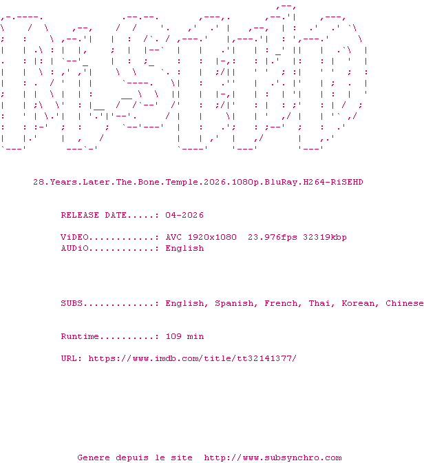 Y avez-vous pense ? Nous proposons déjà 1840 sous-titres pour le film 28 Ans Plus Tard : Le Temple Des Morts. Avez-vous essaye de voir si ces sous-titres etaient compatibles avec cette release ? On vous laisse le soin de tester cela pour nous et de contribuer au site en postant le sous-titre en cas de compatiblite constatee !