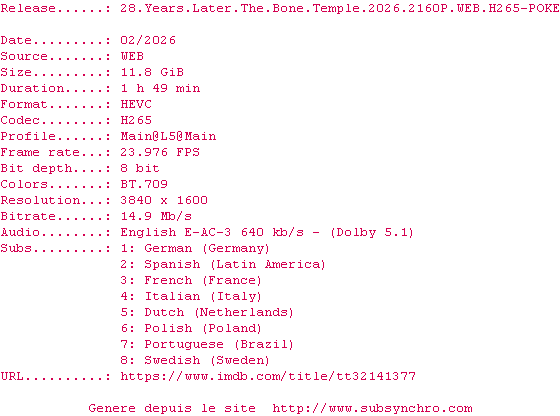 La release 28.Years.Later.The.Bone.Temple.2026.2160P.WEB.H265-POKE est en 4K