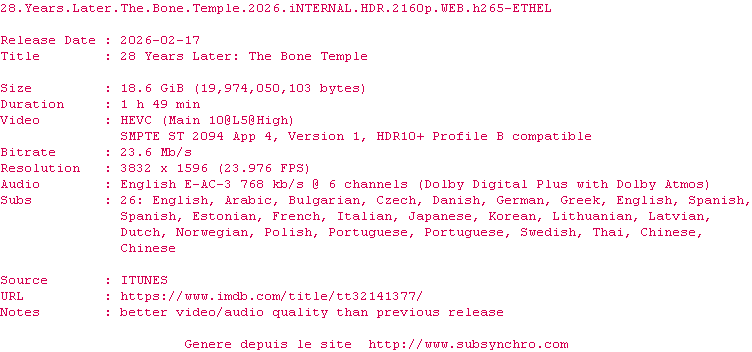 Y avez-vous pense ? Nous proposons déjà 5 sous-titres pour le film 28 Ans Plus Tard : Le Temple Des Morts. Avez-vous essaye de voir si ces sous-titres etaient compatibles avec cette release ? On vous laisse le soin de tester cela pour nous et de contribuer au site en postant le sous-titre en cas de compatiblite constatee !