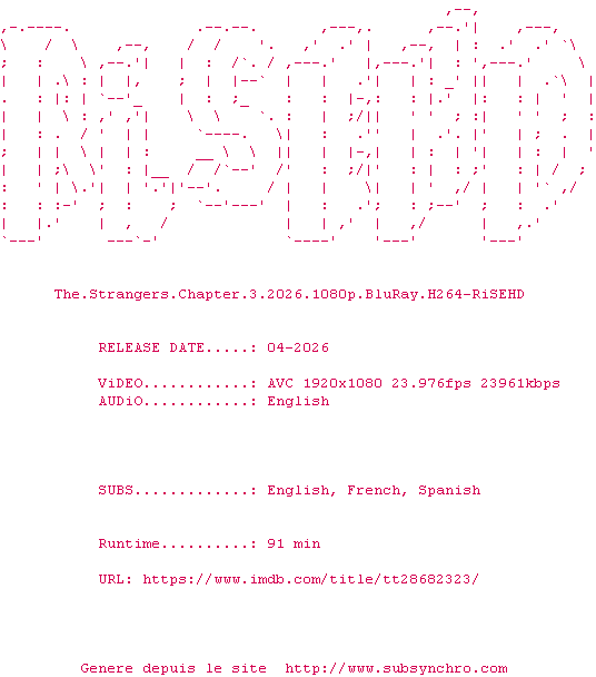 Y avez-vous pense ? Nous proposons déjà 1660 sous-titres pour le film The Strangers - Chapter 3. Avez-vous essaye de voir si ces sous-titres etaient compatibles avec cette release ? On vous laisse le soin de tester cela pour nous et de contribuer au site en postant le sous-titre en cas de compatiblite constatee !