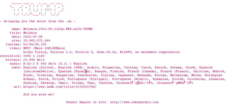Telechargez le RSS « Fichier de la release Melania.2026.DV.2160p.WEB.H265-TRUMP »