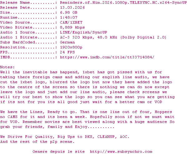 Telechargez le RSS « Fichier de la release Reminders.Of.Him.2026.1080p.TELESYNC.x264-SyncUP »