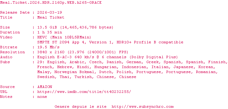 Telechargez le RSS « Fichier de la release Meal.Ticket.2026.HDR.2160p.WEB.H265-GRACE »
