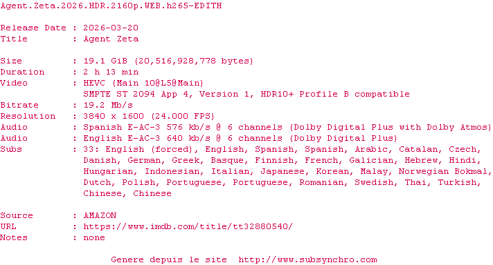 Y avez-vous pense ? Nous proposons déjà 1102 sous-titres pour le film Agent Zeta. Avez-vous essaye de voir si ces sous-titres etaient compatibles avec cette release ? On vous laisse le soin de tester cela pour nous et de contribuer au site en postant le sous-titre en cas de compatiblite constatee !