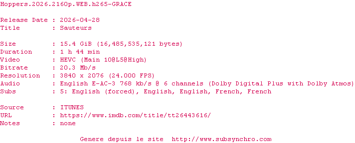 La release Hoppers.2026.2160p.WEB.H265-GRACE est en 4K