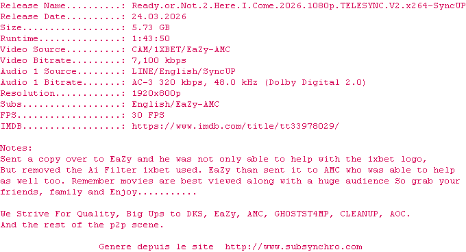 Y avez-vous pense ? Nous proposons déjà 1328 sous-titres pour le film Wedding Nightmare : deuxième partie. Avez-vous essaye de voir si ces sous-titres etaient compatibles avec cette release ? On vous laisse le soin de tester cela pour nous et de contribuer au site en postant le sous-titre en cas de compatiblite constatee !