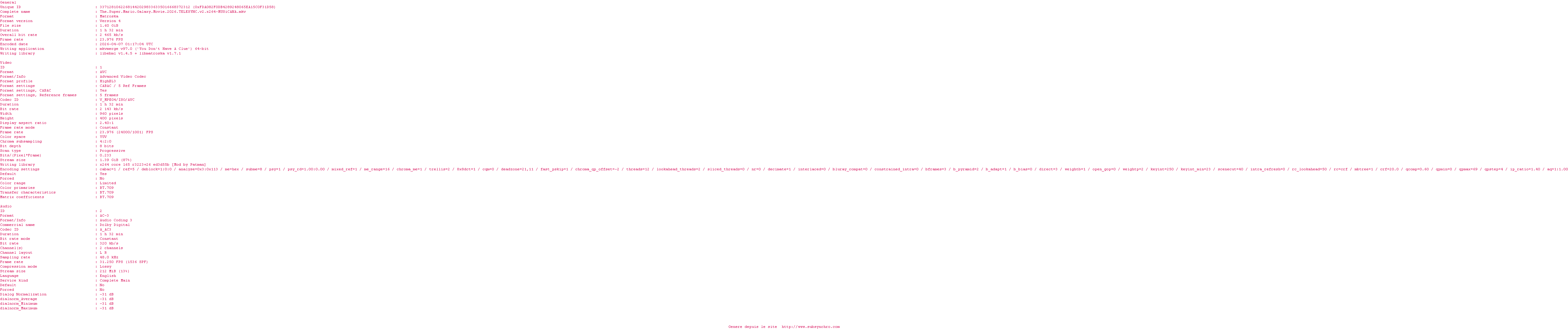 Y avez-vous pense ? Nous proposons déjà 1624 sous-titres pour le film Super Mario Galaxy Le Film. Avez-vous essaye de voir si ces sous-titres etaient compatibles avec cette release ? On vous laisse le soin de tester cela pour nous et de contribuer au site en postant le sous-titre en cas de compatiblite constatee !
