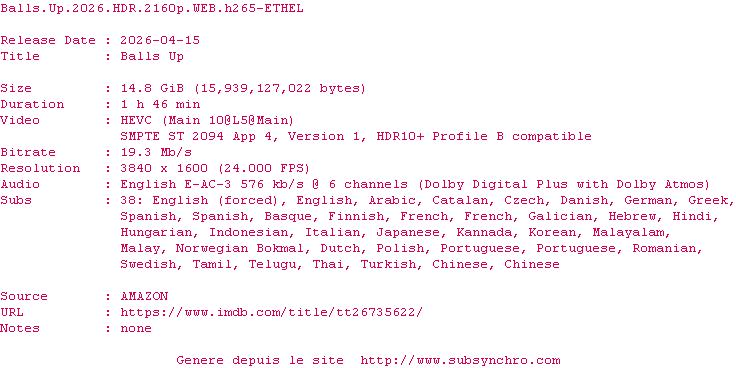Y avez-vous pense ? Nous proposons déjà 1764 sous-titres pour le film Balls Up. Avez-vous essaye de voir si ces sous-titres etaient compatibles avec cette release ? On vous laisse le soin de tester cela pour nous et de contribuer au site en postant le sous-titre en cas de compatiblite constatee !