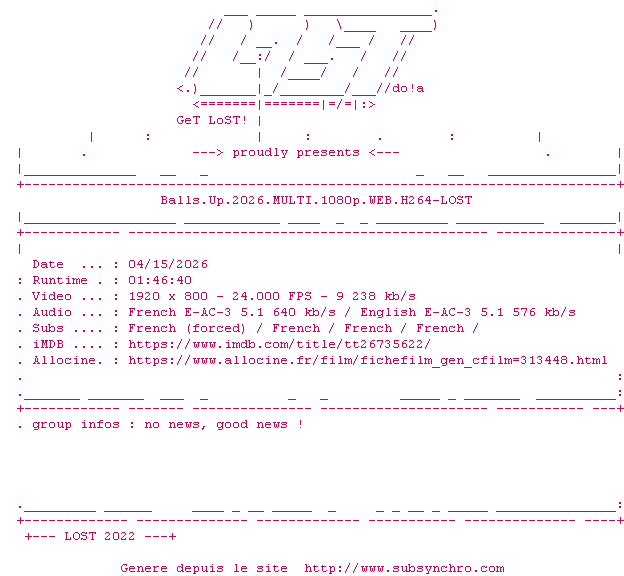 Y avez-vous pense ? Nous proposons déjà 1764 sous-titres pour le film Balls Up. Avez-vous essaye de voir si ces sous-titres etaient compatibles avec cette release ? On vous laisse le soin de tester cela pour nous et de contribuer au site en postant le sous-titre en cas de compatiblite constatee !
