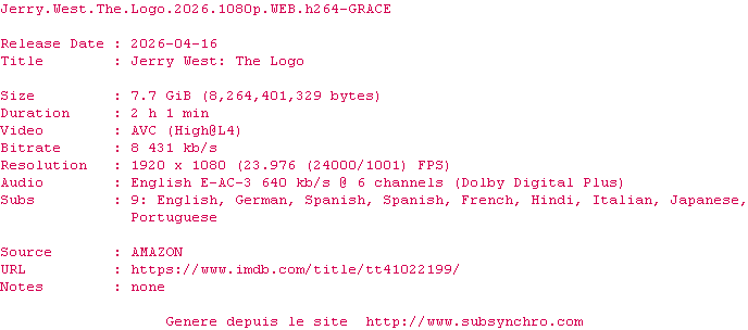Y avez-vous pense ? Nous proposons déjà 1783 sous-titres pour le film Jerry West: The Logo. Avez-vous essaye de voir si ces sous-titres etaient compatibles avec cette release ? On vous laisse le soin de tester cela pour nous et de contribuer au site en postant le sous-titre en cas de compatiblite constatee !