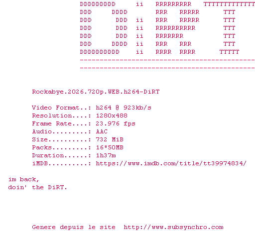 Y avez-vous pense ? Nous proposons déjà 1818 sous-titres pour le film Rockabye. Avez-vous essaye de voir si ces sous-titres etaient compatibles avec cette release ? On vous laisse le soin de tester cela pour nous et de contribuer au site en postant le sous-titre en cas de compatiblite constatee !