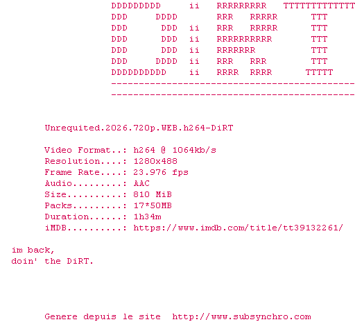 Y avez-vous pense ? Nous proposons déjà 1818 sous-titres pour le film Unrequited. Avez-vous essaye de voir si ces sous-titres etaient compatibles avec cette release ? On vous laisse le soin de tester cela pour nous et de contribuer au site en postant le sous-titre en cas de compatiblite constatee !