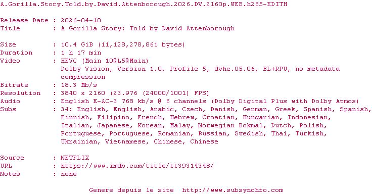 Y avez-vous pense ? Nous proposons déjà 1863 sous-titres pour le film A Gorilla Story: Told by David Attenborough. Avez-vous essaye de voir si ces sous-titres etaient compatibles avec cette release ? On vous laisse le soin de tester cela pour nous et de contribuer au site en postant le sous-titre en cas de compatiblite constatee !