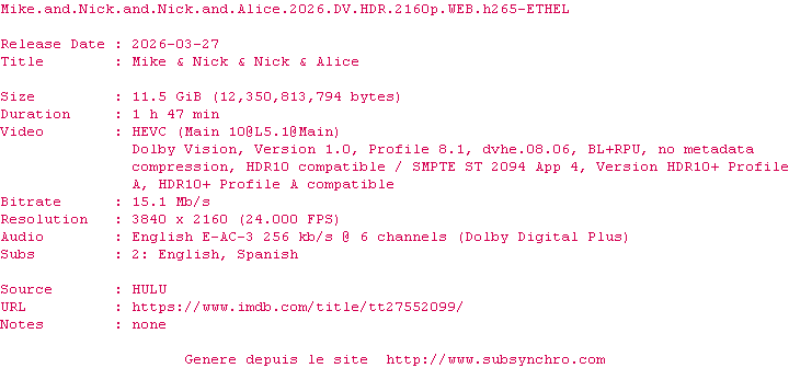 La release Mike.And.Nick.And.Nick.And.Alice.2026.DV.HDR.2160p.WEB.H265-ETHEL est en 4K