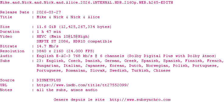 Y avez-vous pense ? Nous proposons déjà 1839 sous-titres pour le film Mike & Nick & Nick & Alice. Avez-vous essaye de voir si ces sous-titres etaient compatibles avec cette release ? On vous laisse le soin de tester cela pour nous et de contribuer au site en postant le sous-titre en cas de compatiblite constatee !