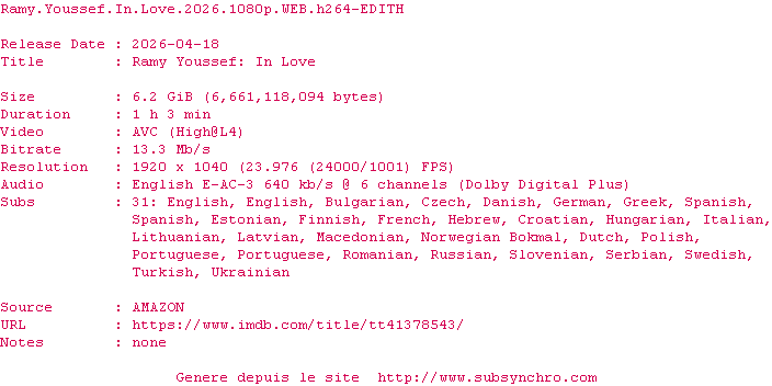 | Voir le nfo de la release Ramy.Youssef.In.Love.2026.1080p.WEB.H264-EDITH | EDITH | Ramy.Youssef.In.Love.2026.1080p.WEB.H264-EDITH OpenSubtitles | 0 fichier | ||