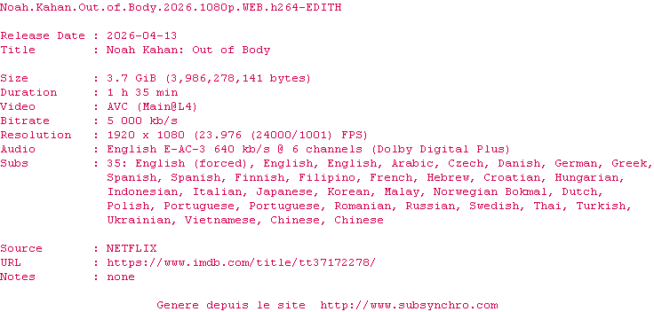 | Voir le nfo de la release Noah.Kahan.Out.Of.Body.2026.1080p.WEB.H264-EDITH | EDITH | Noah.Kahan.Out.Of.Body.2026.1080p.WEB.H264-EDITH OpenSubtitles | 0 fichier | ||