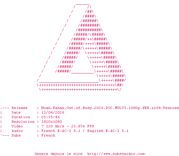 | Voir le nfo de la release Noah.Kahan.Out.Of.Body.2026.DOC.MULTI.1080p.WEB.x264-Penrose | Penrose | Noah.Kahan.Out.Of.Body.2026.DOC.MULTI.1080p.WEB.x264-Penrose OpenSubtitles | 0 fichier | ||