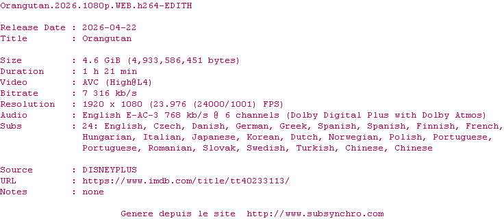 Y avez-vous pense ? Nous proposons déjà 1940 sous-titres pour le film Orang-outan. Avez-vous essaye de voir si ces sous-titres etaient compatibles avec cette release ? On vous laisse le soin de tester cela pour nous et de contribuer au site en postant le sous-titre en cas de compatiblite constatee !