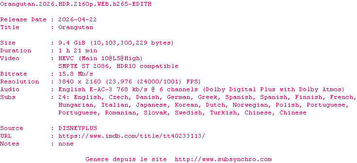 Y avez-vous pense ? Nous proposons déjà 1940 sous-titres pour le film Orang-outan. Avez-vous essaye de voir si ces sous-titres etaient compatibles avec cette release ? On vous laisse le soin de tester cela pour nous et de contribuer au site en postant le sous-titre en cas de compatiblite constatee !