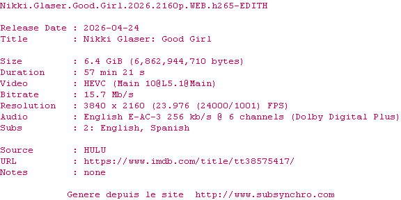 Y avez-vous pense ? Nous proposons déjà 2025 sous-titres pour le film Nikki Glaser: Good Girl. Avez-vous essaye de voir si ces sous-titres etaient compatibles avec cette release ? On vous laisse le soin de tester cela pour nous et de contribuer au site en postant le sous-titre en cas de compatiblite constatee !