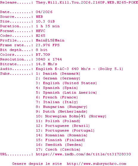 Y avez-vous pense ? Nous proposons déjà 2126 sous-titres pour le film They Will Kill You. Avez-vous essaye de voir si ces sous-titres etaient compatibles avec cette release ? On vous laisse le soin de tester cela pour nous et de contribuer au site en postant le sous-titre en cas de compatiblite constatee !
