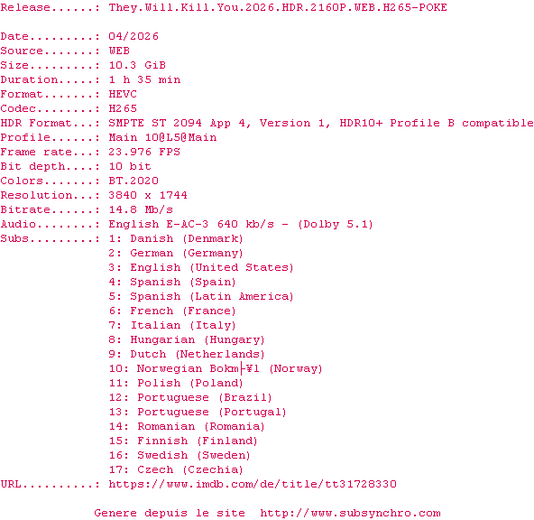 La release They.Will.Kill.You.2026.HDR.2160P.WEB.H265-POKE est en 4K