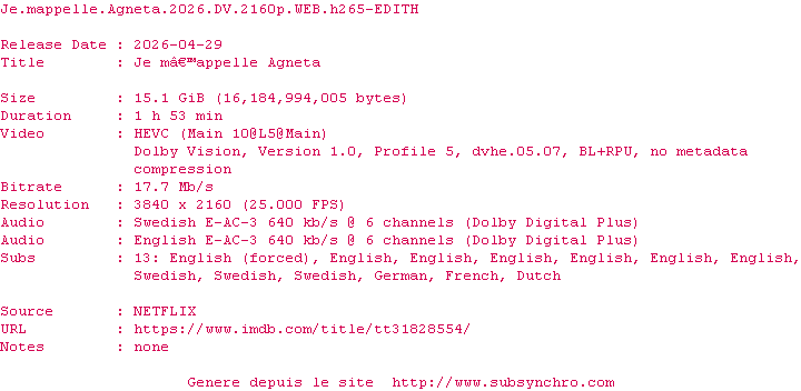 La release Je.Mappelle.Agneta.2026.DV.2160p.WEB.H265-EDITH est en 4K