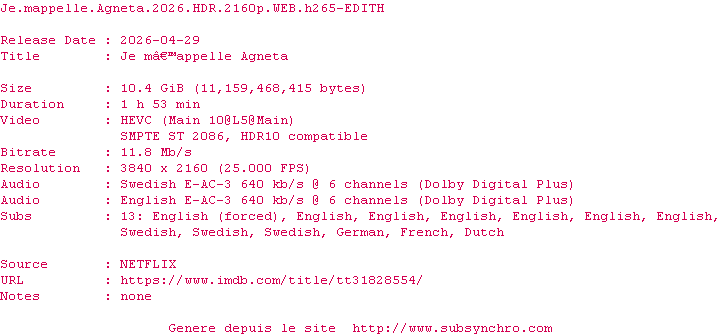 Y avez-vous pense ? Nous proposons déjà 2207 sous-titres pour le film Je m'appelle Agneta. Avez-vous essaye de voir si ces sous-titres etaient compatibles avec cette release ? On vous laisse le soin de tester cela pour nous et de contribuer au site en postant le sous-titre en cas de compatiblite constatee !