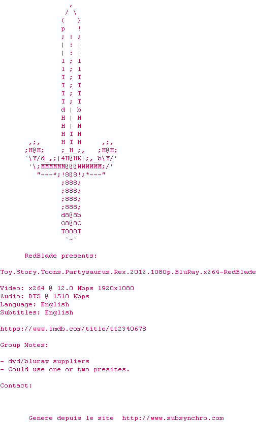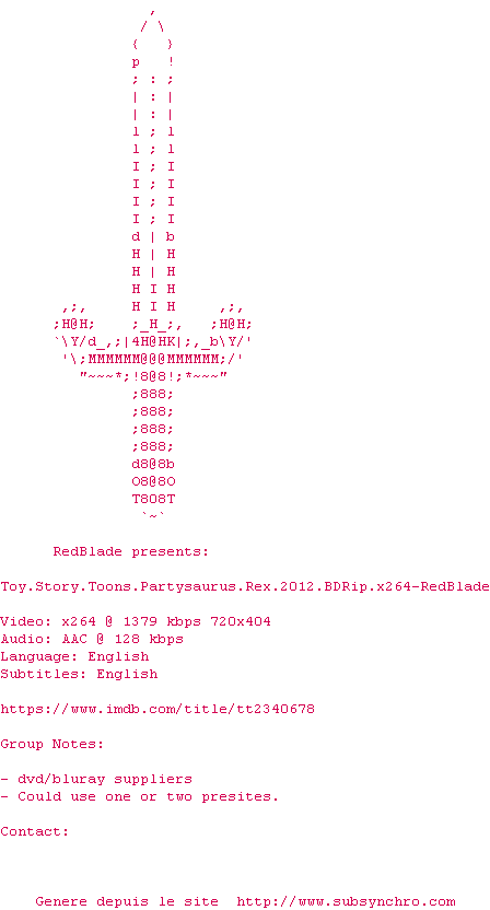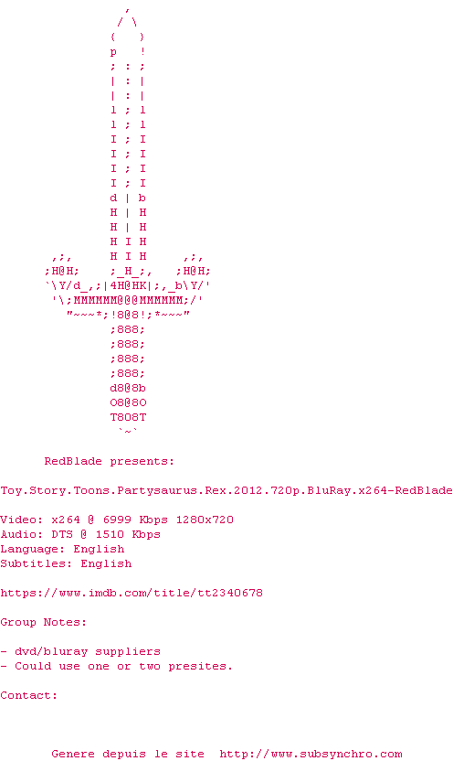 Voir le nfo de la release Toy.Story.Toons.Partysaurus.Rex.2012.BDRip.x264-RedBlade