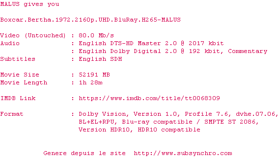 Voir le nfo de la release Boxcar.Bertha.1972.2160p.UHD.BluRay.H265-MALUS