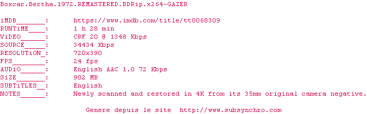 Voir le nfo de la release Boxcar.Bertha.1972.REMASTERED.1080p.BluRay.x264-GAZER