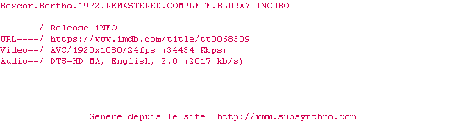 Voir le nfo de la release Boxcar.Bertha.1972.REMASTERED.COMPLETE.BLURAY-INCUBO