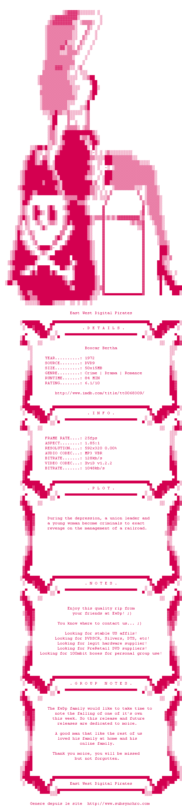 Voir le nfo de la release Boxcar.Bertha.1972.WS.DVDRip.XViD.INT-EwDp